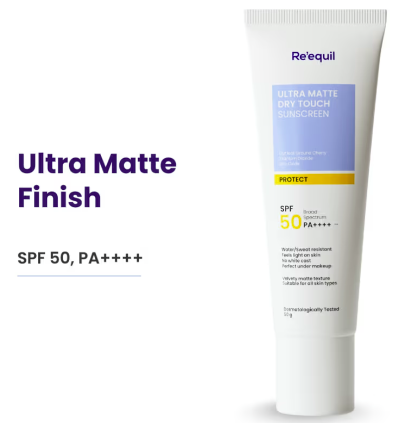 This cult-favorite Re’equil Ultra Matte Dry-Touch Sunscreen Gel gives your skin a velvety matte finish with no greasiness. It’s oil-free, silicone-based, and provides broad-spectrum SPF 50 PA++++ protection — ideal for long hours outdoors.