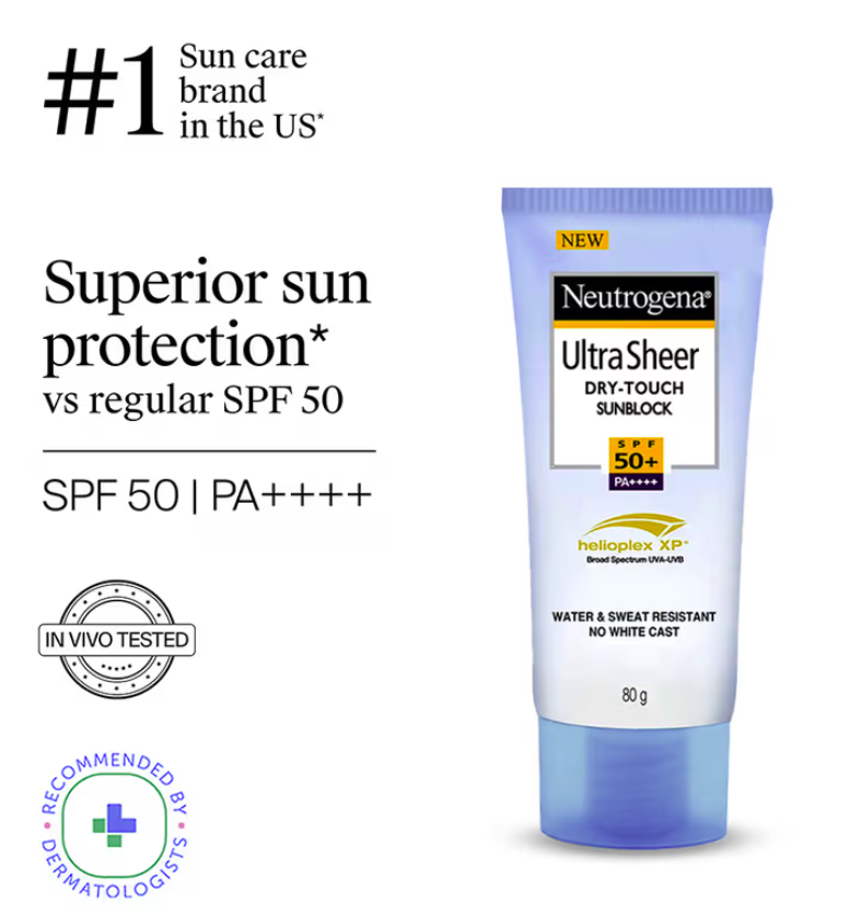 A long-time favorite, Neutrogena Ultra Sheer Sunscreen offers reliable, broad-spectrum protection in a lightweight, non-sticky formula. It’s water-resistant and suitable for outdoor activities.
